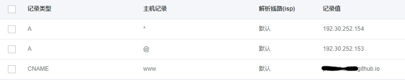 其中两条记录A指向的ip地址是Github Page提供的ip,CNAME记录指定的是你在Github创建的仓库。