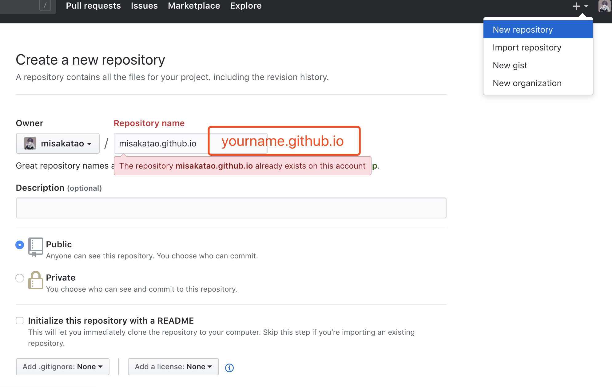 创建与你的Github用户名相对应的Github Page仓库,格式必须是username.github.io。